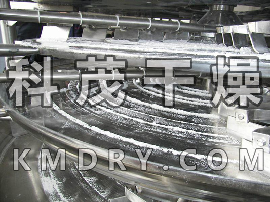 湿物料自加料器连续地加到干燥器上部第一层干燥盘上,带有耙叶的耙臂作回转运动使耙叶连续地翻抄物料。物料沿指数螺旋线渡过干燥盘表面,在小干燥盘上的物料被移送到外缘,并在外缘落到下方的大干燥盘外缘,在大干燥盘上物料向里移动并从中间落料口落入下一层小干燥盘中。大小干燥盘上下交替排列,物料得以连续地流过整个干燥器。中空的干燥盘内通入加热介质,加热介质可选饱和蒸汽、热水和导热油。加热介质由干燥盘的一端进入,从另一端导出。